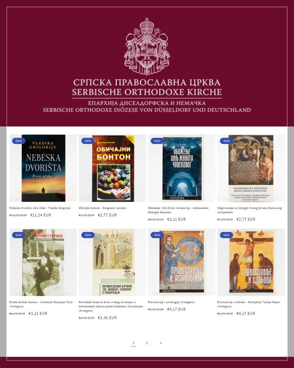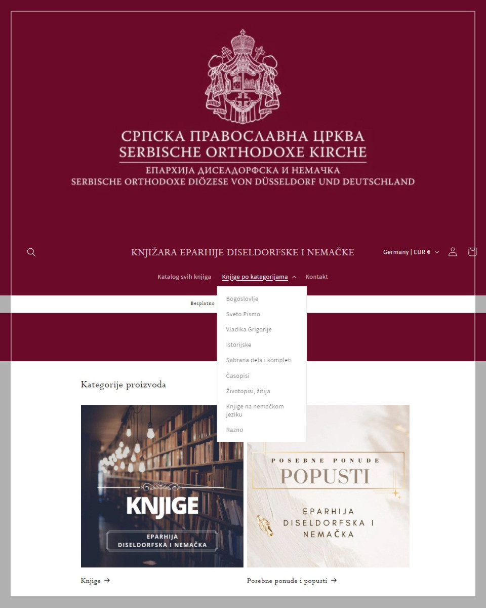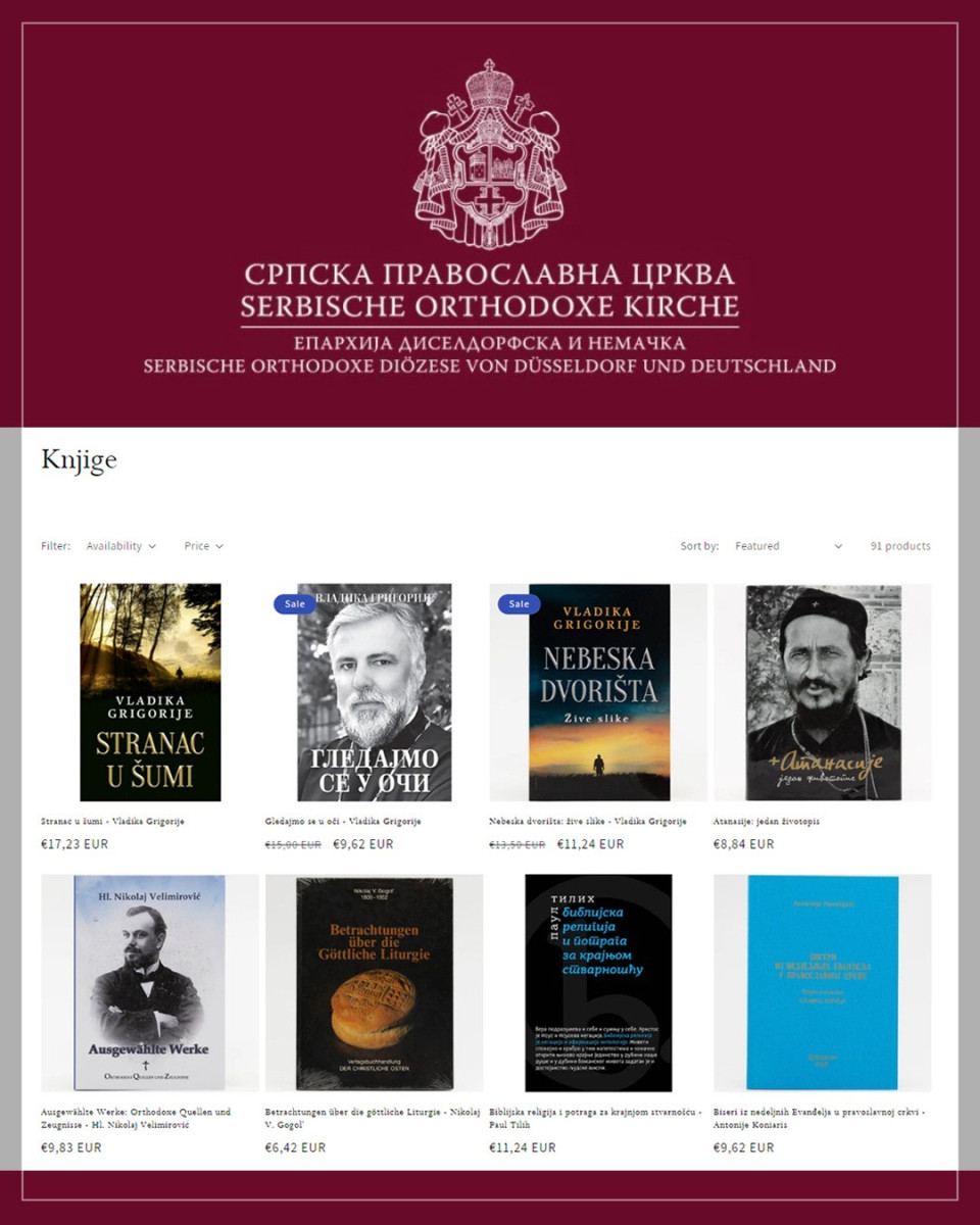 Излазећи у сусрет великом броју захтева љубитеља писане речи, Епархија диселдорфска и немачка, по благослову Митрополита немачког Григорија, покренула је интернет књижару где ће сви заинтересовани из Немачке, али и других земаља Европске уније, Швајцарске и Велике Британије, бити у прилици да поруче дела хришћанских писаца, релевантну богословску литературу, али и књиге за свакога ко хоће да се упозна са вером и животом у Цркви. Трудићемо се да, осим наслова на српском језику, читаоцу понудимо и наслове на немачком и енглеском језику.