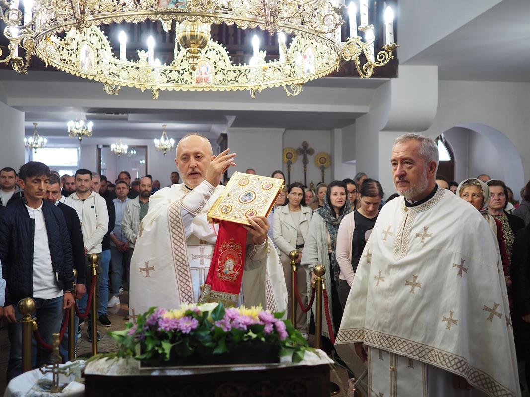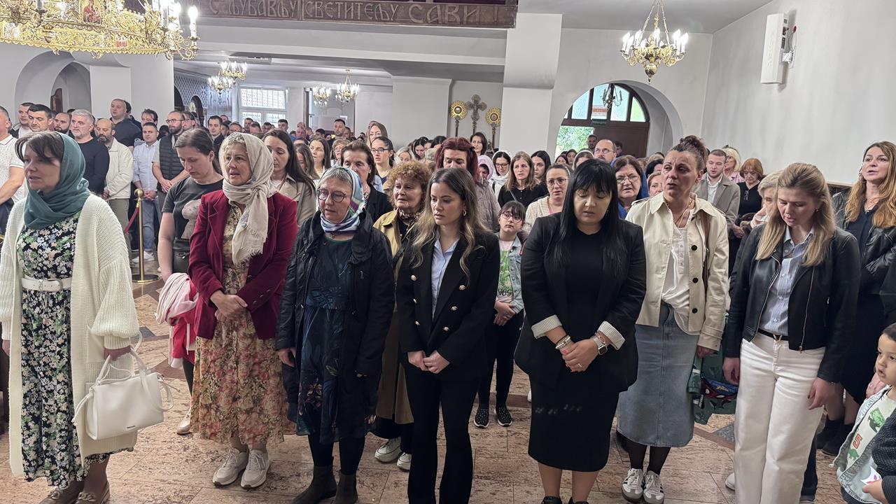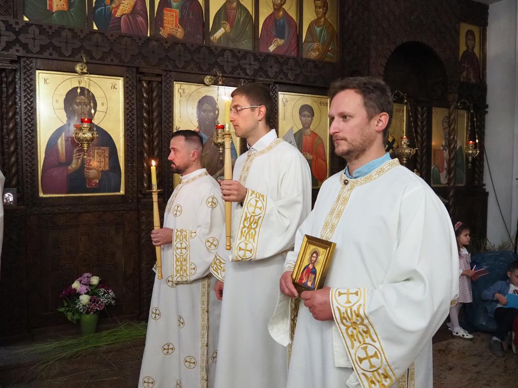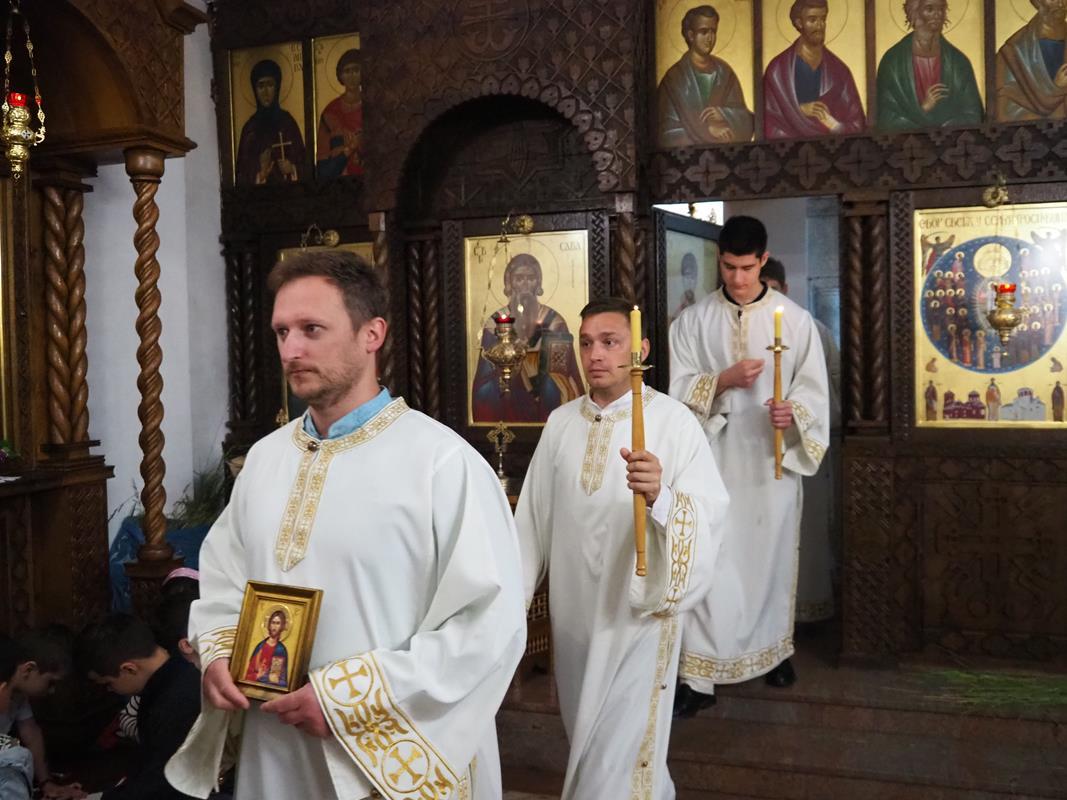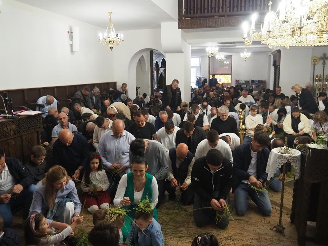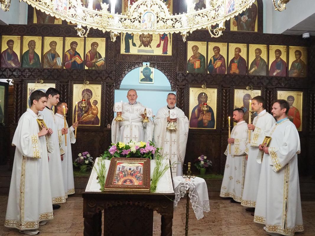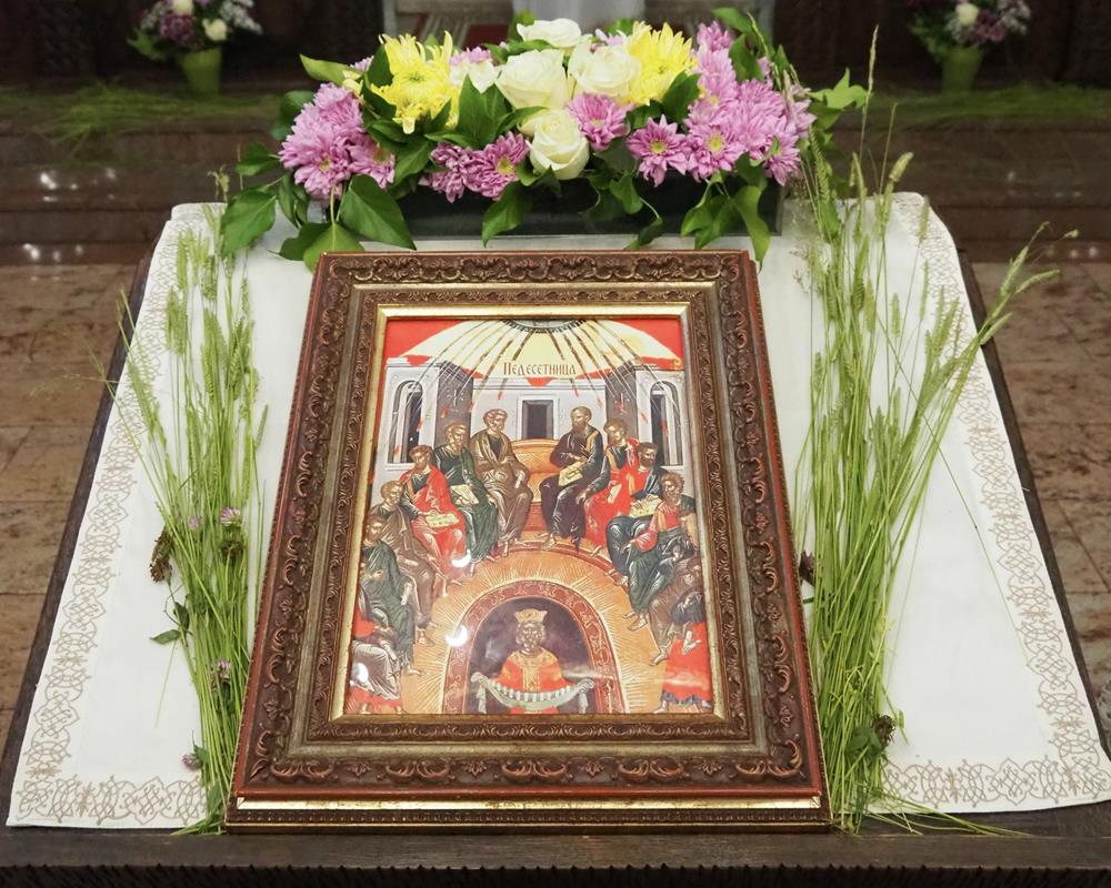 Свету Литургију служио је протојереј Станко Ракић, уз саслужење протојереја Драгослава Ћорковића. У надахнутој беседи, отац Станко подсетио је да је на данашњи дан, педесет дана по Васкрсењу, Свети Дух сишао на апостоле у облику огњених језика, испунивши Христово обећање да ће им послати Утешитеља. Тим догађајем започела је мисија Цркве у свету – зато овај дан називамо и рођенданом Цркве.