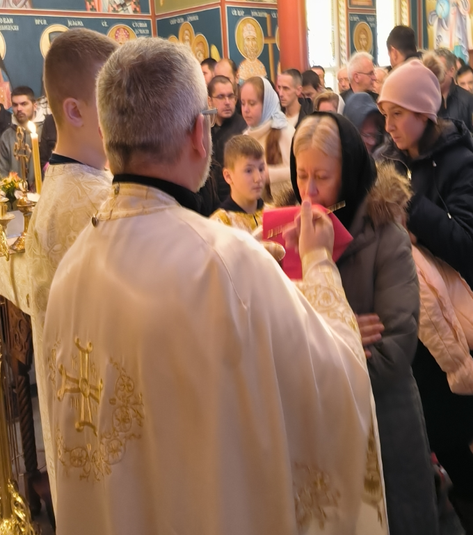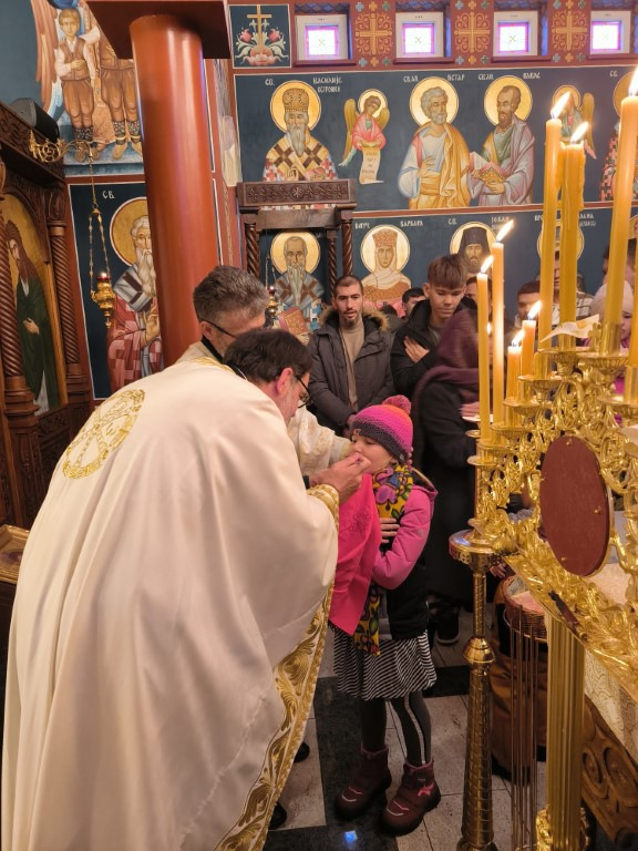 На крају Св. Литургије, у светосавској сали, освећена су славска обележја и изабрани су нови кумови за наредну годину: породица Павловић, Стојанов, Танурџиж и Мијановић.