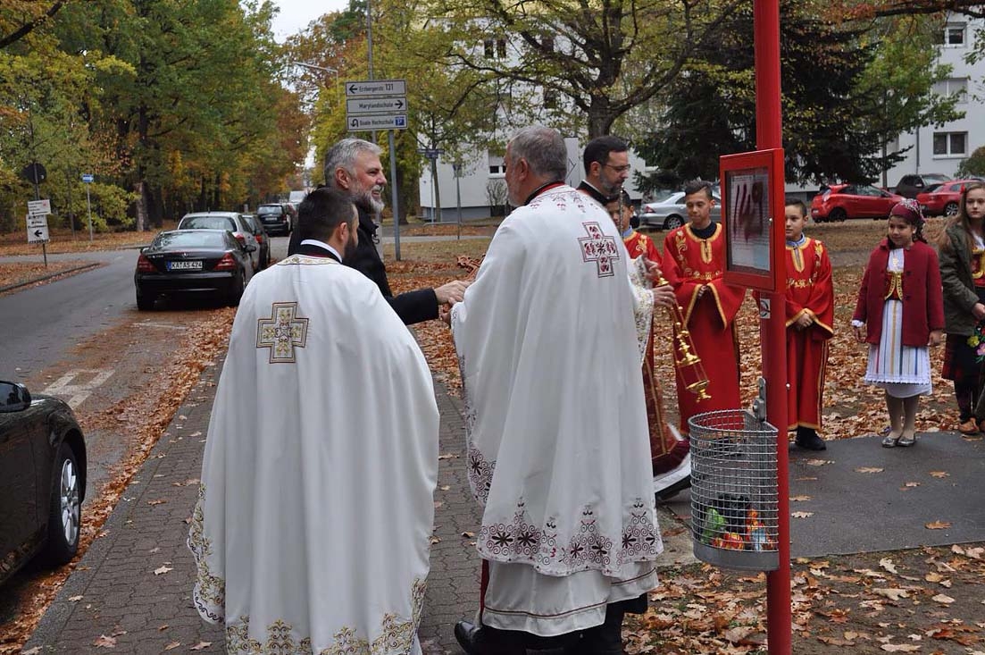 Након прочитаног јеванђеља Епископ Григорије поучио је верни народ архипастирском беседом у којој се осврнуо на причу о мудрим и лудим девојкама нагласивши три момента: разум, будност и врлину, на тај начин правећи паралелу са светим животом преподобне Параскеве. Након Свете литургије пререзан је и славски колач. Овогодишњи кумови храмовне славе били су чланови породице Тегелтија из Форста, а кумство за следећу годину преузела је Мара Жмирић из Карлсруеа.