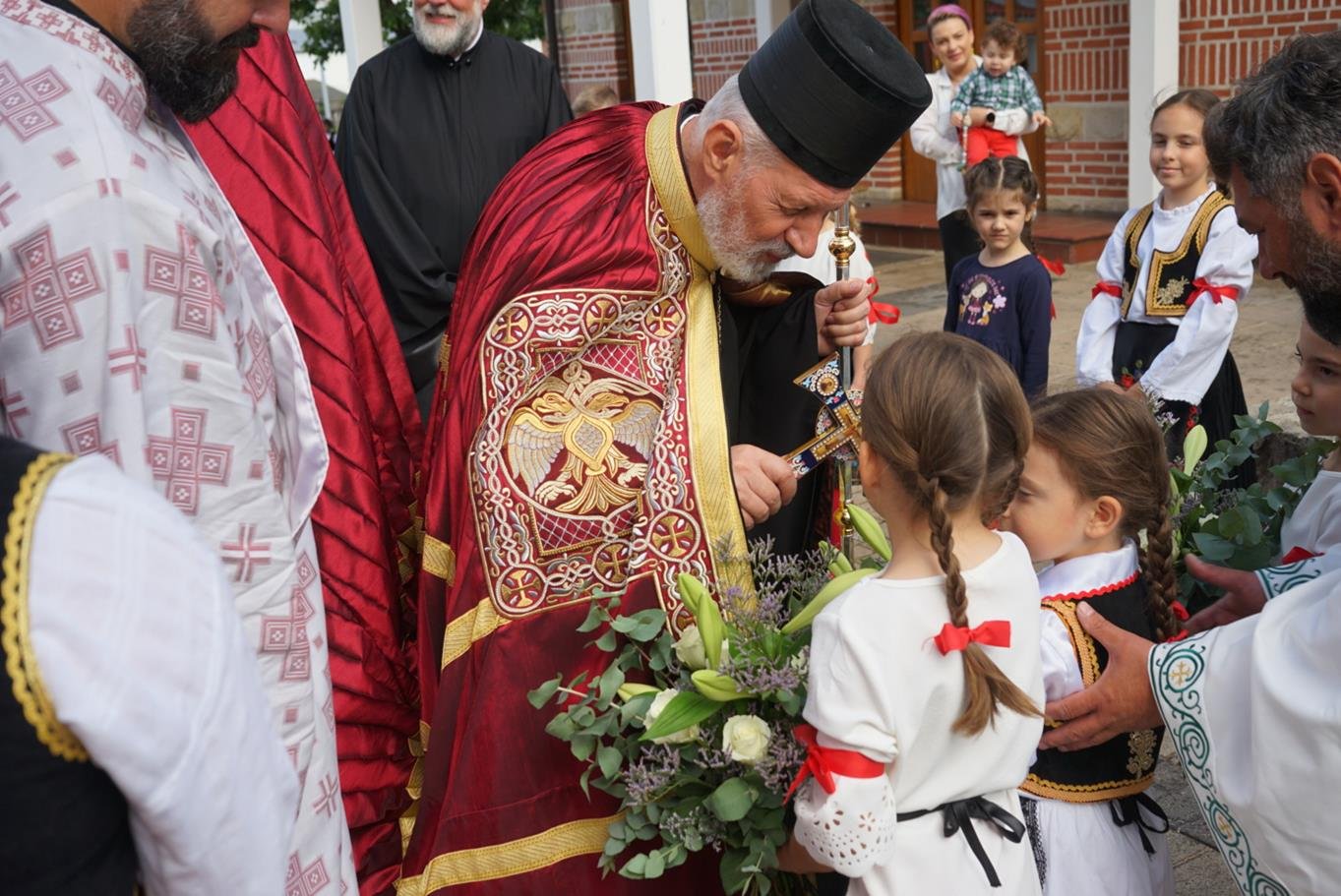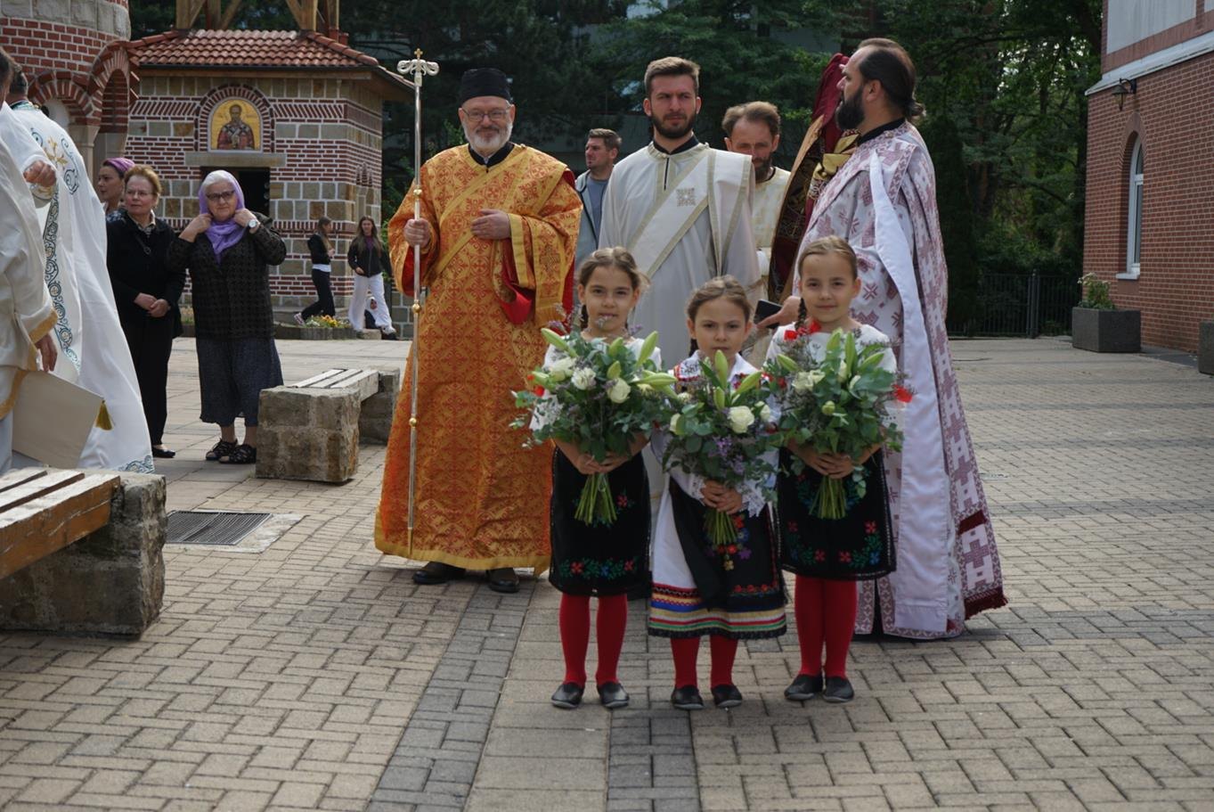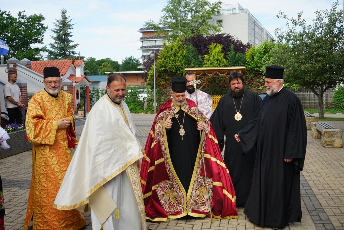 „Брате Григорије, начелниче Цркве Божије у Немачкој, драги брате Јоване, драги оци моји, драга браћо и сестре, преносим вам поздраве Цркве Божије у Пожаревцу и Браничеву где сам ја епископ; јер управо ми, епископи, не можемо без заједнице, нисмо индивидуе јер нико не може бити хришћанин сам, како каже латинска пословица »Unus christianus – nullus christianus«. To нам говори да је наша вера заједница. Ових дана смо славили вазнесење Христово на небо, али нам је Он обећао и да ће нам послати Духа Светога, и који је дошао, како каже Апостол, у последње дане, доносећи радост. Наше спасење, драга браћо и сестре, је дело Свете Тројице. Од Бога Оца почиње свака иницијатива и Он је из љубави хтео да створи нас ни из чега, желећи да ми будемо вечно живи, али у заједници са Њим. Не можемо живети вечно – будући да смо створени ни из чега – ако немамо заједницу са Господом, и управо због тога је и Света Тројица одлучила да Син Божији буде тај који ће нас сјединити са Богом Оцем, што је и учињено када је Господ дошао, страдао за нас, али и васкрсао, те показао да у заједници са Њим можемо да имамо живот вечни. Дух Свети учествује, такође, посредујући у нашем сједињењу Сина Божијега са нама јер Син Божији се родио као човек Духом Светим, како каже Свето Писмо. Тако, после вазнесења на небо, Дух Свети је тај који нас и даље сједињује са Христом кроз крштење, градећи на тај начин литургијску заједницу. Због тога се у Литургији пројављује сам Господ јер, као што каже свети Игнатије Богоносац, да тамо где где је епископ, тамо нека буде и народ сав верни јер, као што тамо где је Христос, тамо је васељенска Црква. Дакле, то је светитељ из првог века који сведочи да је Христос присутан у свету након свог вазнесења али као литургијска заједница. Нико не може доћи у заједницу са Христом мимо Литургије, те тако Дух Свети крштењем сједињује у Литургију. Крштење је неодвојиво од Литургије, пројављујући овде Христа на иконијски начин. Наравно, ми очекујемо да Христос дође. Дакле, ми се радујемо кад год се саберемо на Литургији јер се сједињујемо са Господом, али на крају сваке Литургије излазимо у свет и чекамо да нам дође Господ. Ако Господ не дође други пут, и не буде васкрсења мртвих, тада је, како каже апостол Павле, узалудна проповед наша и вера ваша. Господ је обећао да ће нам доћи али је оставио то, како и сам каже, у власти свог Оца, да Бог Отац одлучи када ће се то бити. Дотле ми треба да имамо на уму, драга браћо и сестре, да наша вера спашава од смрти од које нико не може да нас спасе осим Господ, односно, јединство са Њим. Међутим, треба имати у виду да се вера наша пројављује као заједница. Уз сву свест о тешкоћама везаним за посао и удаљеност једних од других, али и цркава, трудите се ипак да Литургију не пропуштате јер то је много важно. У литургији, као што рекох, се сједињујемо са Господом и предокушамо Царство Божије које нам је Господ обећао. По речи Апостола, да када дође Господ, окупиће све народе око себе и тада ће установити вечно своје царство. Тако, заједница верних око епископа иконизује будуће царство које очекујемо.
