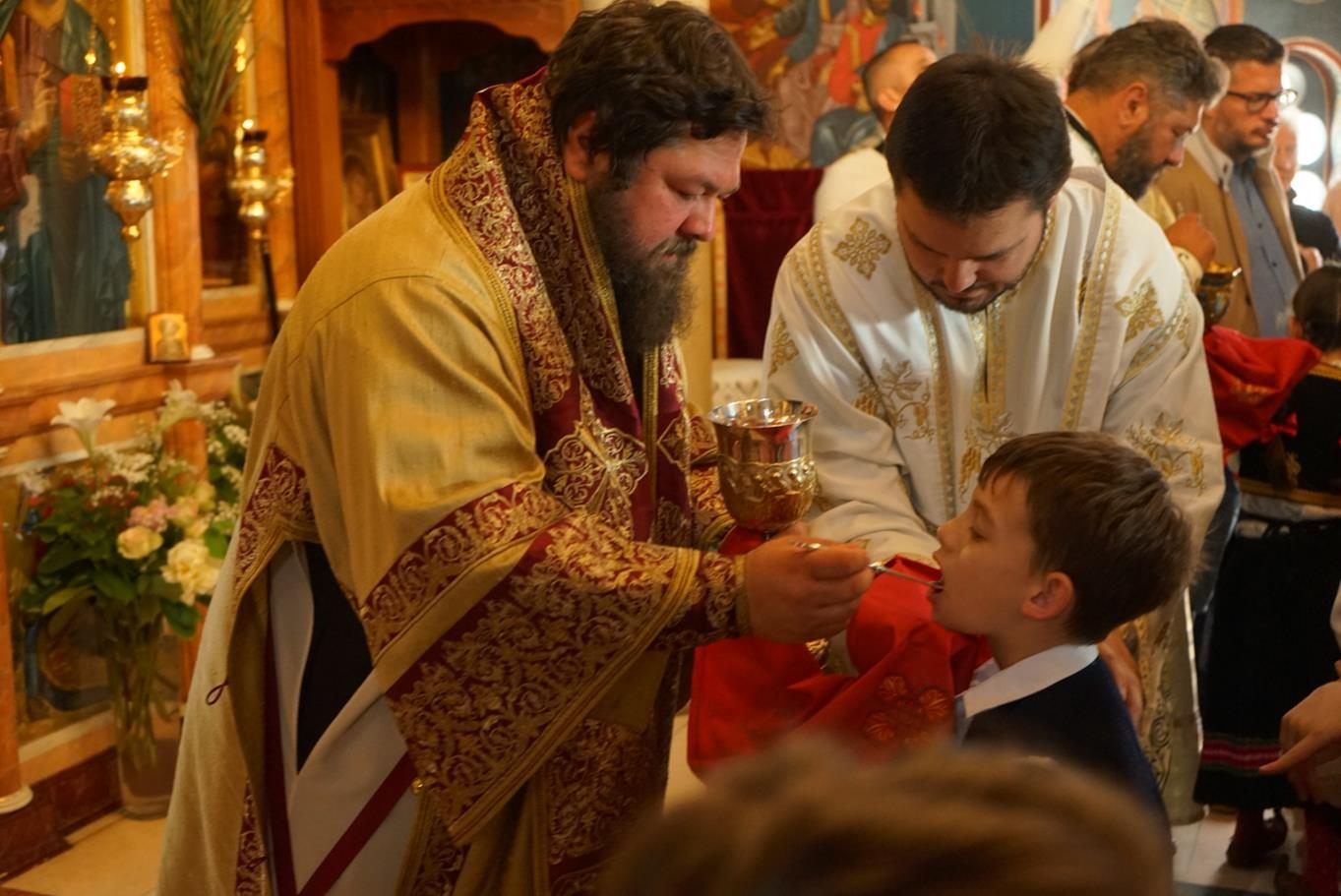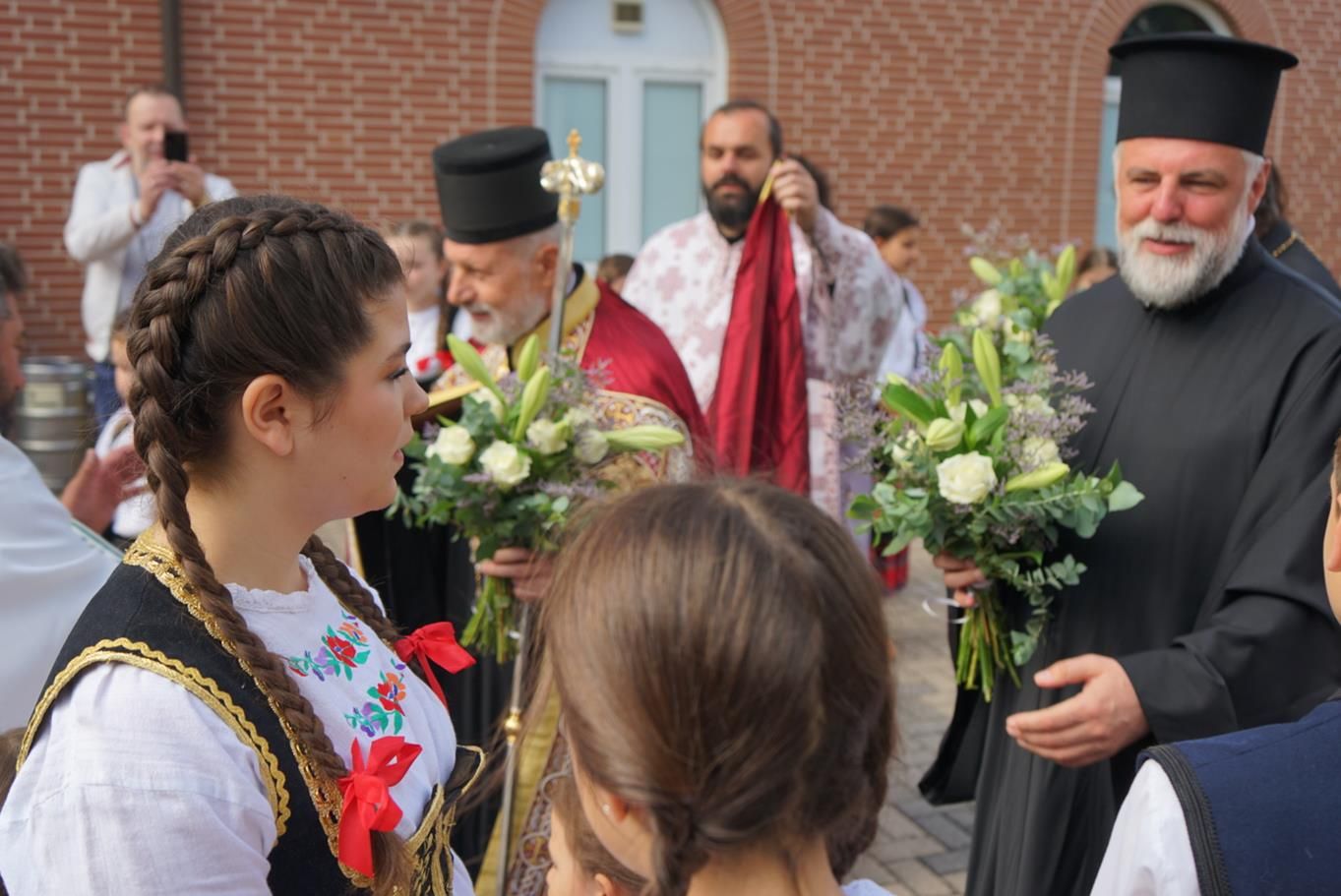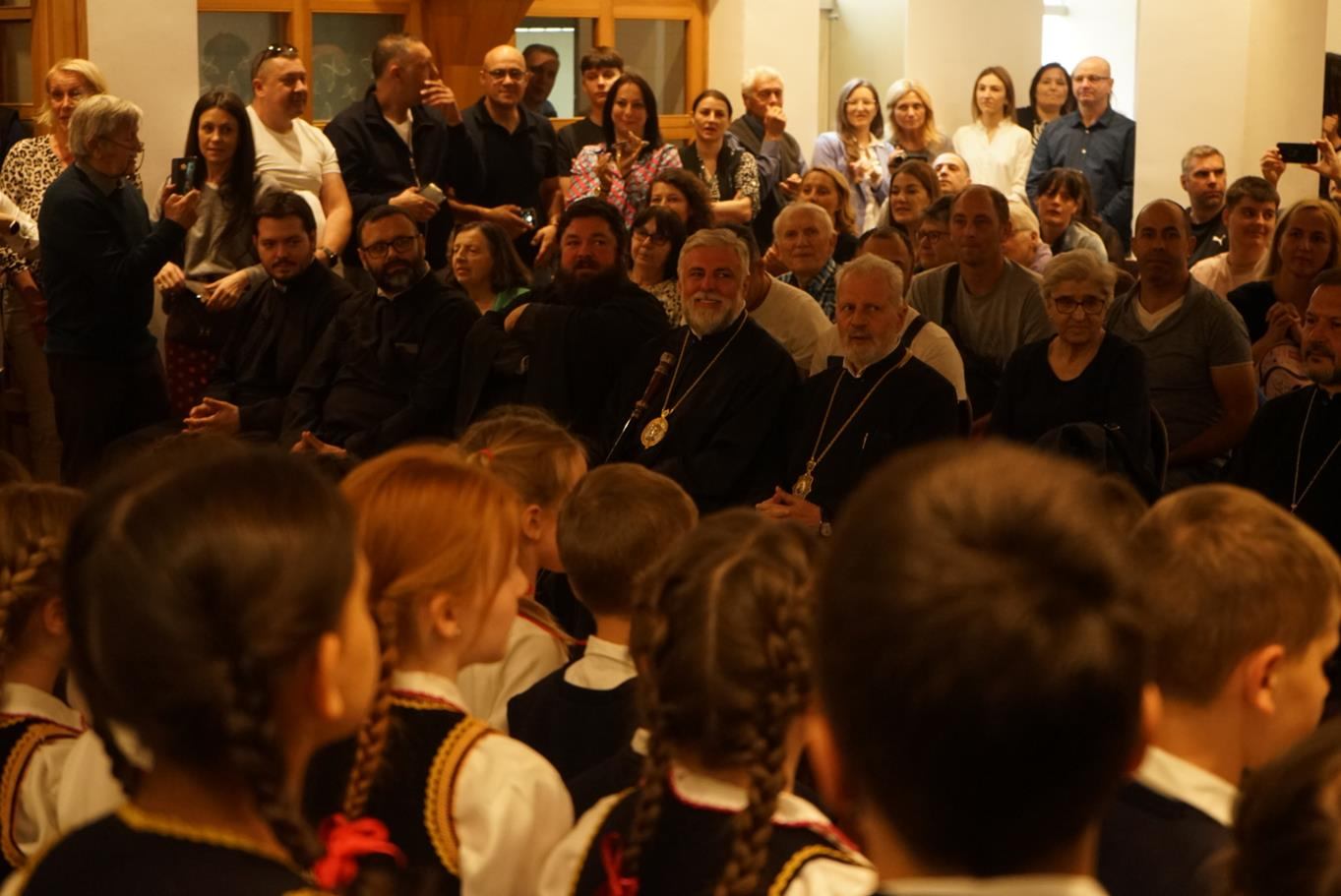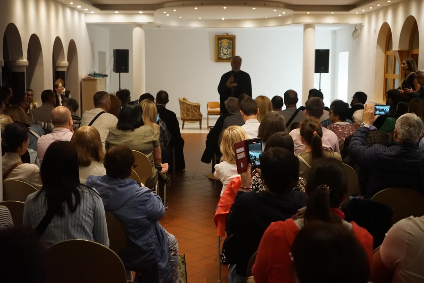 „Брате Григорије, начелниче Цркве Божије у Немачкој, драги брате Јоване, драги оци моји, драга браћо и сестре, преносим вам поздраве Цркве Божије у Пожаревцу и Браничеву где сам ја епископ; јер управо ми, епископи, не можемо без заједнице, нисмо индивидуе јер нико не може бити хришћанин сам, како каже латинска пословица »Unus christianus – nullus christianus«. To нам говори да је наша вера заједница. Ових дана смо славили вазнесење Христово на небо, али нам је Он обећао и да ће нам послати Духа Светога, и који је дошао, како каже Апостол, у последње дане, доносећи радост. Наше спасење, драга браћо и сестре, је дело Свете Тројице. Од Бога Оца почиње свака иницијатива и Он је из љубави хтео да створи нас ни из чега, желећи да ми будемо вечно живи, али у заједници са Њим. Не можемо живети вечно – будући да смо створени ни из чега – ако немамо заједницу са Господом, и управо због тога је и Света Тројица одлучила да Син Божији буде тај који ће нас сјединити са Богом Оцем, што је и учињено када је Господ дошао, страдао за нас, али и васкрсао, те показао да у заједници са Њим можемо да имамо живот вечни. Дух Свети учествује, такође, посредујући у нашем сједињењу Сина Божијега са нама јер Син Божији се родио као човек Духом Светим, како каже Свето Писмо. Тако, после вазнесења на небо, Дух Свети је тај који нас и даље сједињује са Христом кроз крштење, градећи на тај начин литургијску заједницу. Због тога се у Литургији пројављује сам Господ јер, као што каже свети Игнатије Богоносац, да тамо где где је епископ, тамо нека буде и народ сав верни јер, као што тамо где је Христос, тамо је васељенска Црква. Дакле, то је светитељ из првог века који сведочи да је Христос присутан у свету након свог вазнесења али као литургијска заједница. Нико не може доћи у заједницу са Христом мимо Литургије, те тако Дух Свети крштењем сједињује у Литургију. Крштење је неодвојиво од Литургије, пројављујући овде Христа на иконијски начин. Наравно, ми очекујемо да Христос дође. Дакле, ми се радујемо кад год се саберемо на Литургији јер се сједињујемо са Господом, али на крају сваке Литургије излазимо у свет и чекамо да нам дође Господ. Ако Господ не дође други пут, и не буде васкрсења мртвих, тада је, како каже апостол Павле, узалудна проповед наша и вера ваша. Господ је обећао да ће нам доћи али је оставио то, како и сам каже, у власти свог Оца, да Бог Отац одлучи када ће се то бити. Дотле ми треба да имамо на уму, драга браћо и сестре, да наша вера спашава од смрти од које нико не може да нас спасе осим Господ, односно, јединство са Њим. Међутим, треба имати у виду да се вера наша пројављује као заједница. Уз сву свест о тешкоћама везаним за посао и удаљеност једних од других, али и цркава, трудите се ипак да Литургију не пропуштате јер то је много важно. У литургији, као што рекох, се сједињујемо са Господом и предокушамо Царство Божије које нам је Господ обећао. По речи Апостола, да када дође Господ, окупиће све народе око себе и тада ће установити вечно своје царство. Тако, заједница верних око епископа иконизује будуће царство које очекујемо.